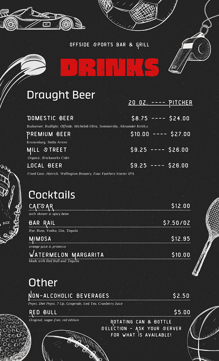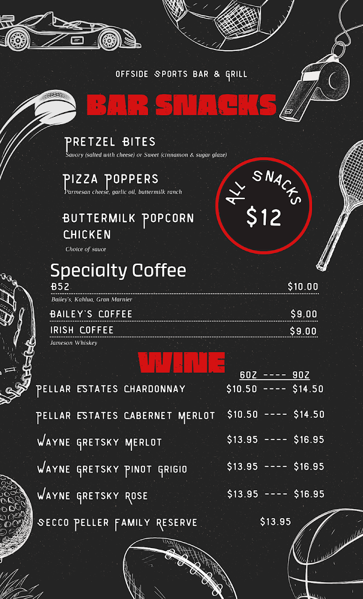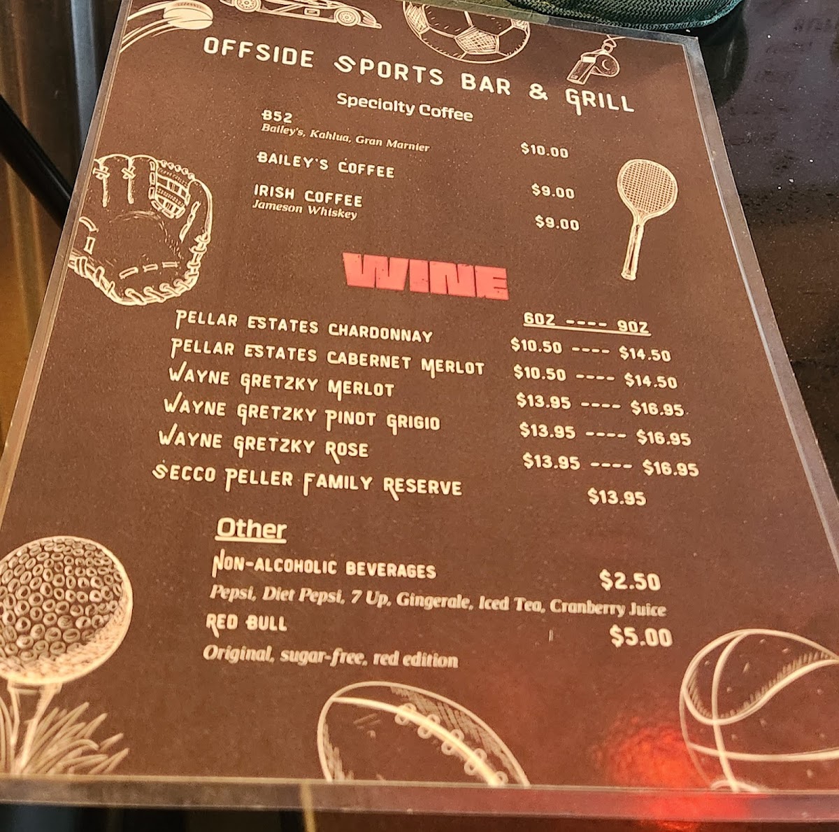 Behind the bar, Offside doesn’t disappoint - from Domestic Beer and Mill Street Local Beer to Guinness, Caesar cocktails, and Watermelon Margarita. Premium picks like Kronenbourg and Wayne Gretzky Merlot elevate the drink list, complemented by Specialty Coffees such as B52 and Bailey’s Coffee.