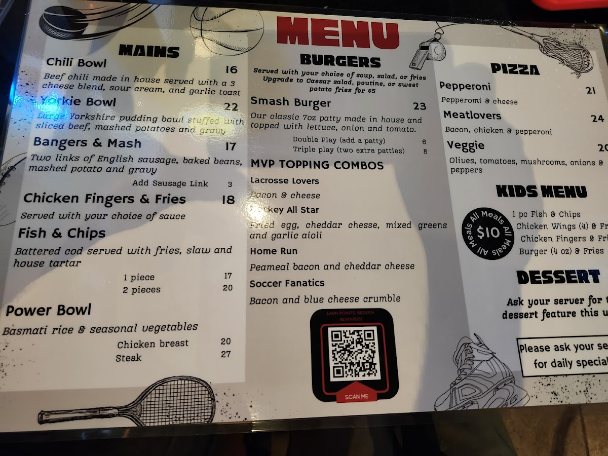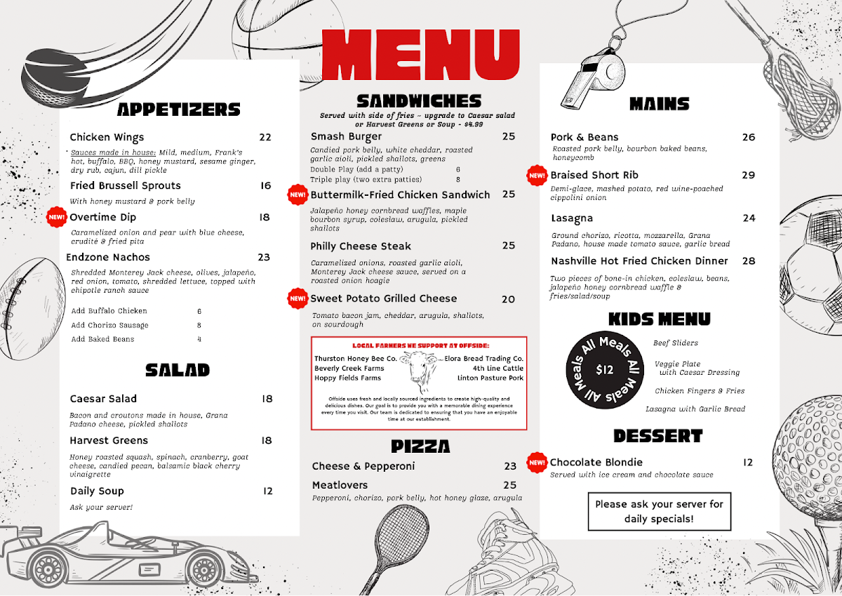 The Mains bring a homestyle charm with dishes like Chili Bowl, Yorkie Bowl, Bangers & Mash, and the ever-popular Fish & Chips. Burger enthusiasts can dig into the juicy Smash Burger, while adventurous eaters might try sides like Quesadilla, Poutine, or Offside Veggie Fries. For something extra special, Pretzel Bites and Buttermilk Popcorn Chicken make perfect Bar Snacks, and the Chocolate Blondie dessert rounds off the experience with a sweet finale.